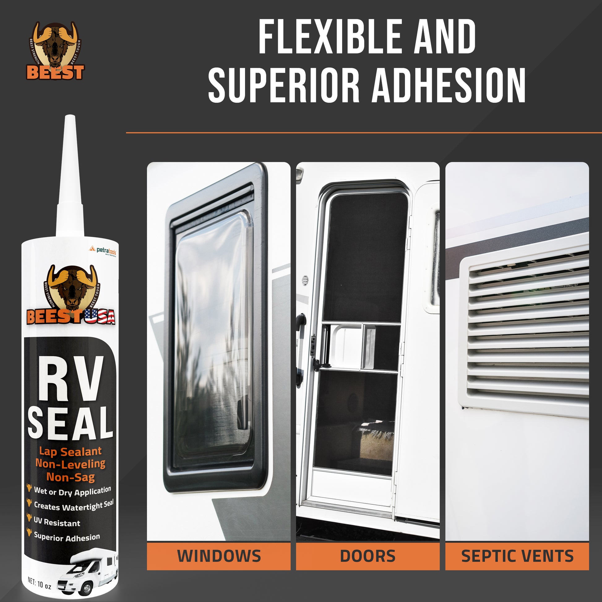 BEEST Non-Leveling Lap Sealant is the ultimate solution for all your RV sealing and caulking needs. This versatile product excels as an RV window sealant, RV roof sealant, and trailer roof sealant, specifically designed to address leaks and cracks on vertical and overhead surfaces. Unlike self-leveling sealants, BEEST's non-sagging formula ensures that it maintains its shape and consistency, providing a uniform and effective seal without dripping or sagging. Ideal for a wide range of applications, BEEST's sealant is perfect for sealing and protecting walls, windows, doors, roof edges, air conditioning units, and more. It’s especially effective for camper roofs made from EPDM, TPO, metal, and a variety of other substrates. This makes it not only a must-have for RV owners but also a valuable tool for DIY enthusiasts and repair professionals. BEEST's non-leveling silicone caulk creates a flexible, non-cracking seal that is both waterproof and quick-drying. Its UV-resistant and non-toxic properties make it safe for both indoor and outdoor use, offering protection against the elements and ensuring long-lasting durability. The sealant's superior adhesion means it will stay firmly in place, even in harsh weather conditions, providing reliable leak prevention you can count on. Application is simple and hassle-free: prepare the area, apply the sealant, and let it dry to create a watertight seal. This ease of use makes it ideal for quick repairs and routine maintenance, saving you time and effort while ensuring robust protection. Moreover, BEEST's non-leveling lap sealant provides exceptional value. Its cost-effective formula offers significant savings by preventing costly water damage, thus protecting your property and ensuring the safety of your loved ones. The 10 oz. tube is economical yet highly effective, delivering unmatched versatility and peace of mind. For those seeking a dependable, high-performance sealant for their RV or camper, BEEST Non-Leveling Lap Sealant is the ultimate choice. It combines strength, durability, and ease of use in a product designed to meet the rigorous demands of both professional and DIY applications. Protect your investment with BEEST, the trusted name in sealing and waterproofing solutions.